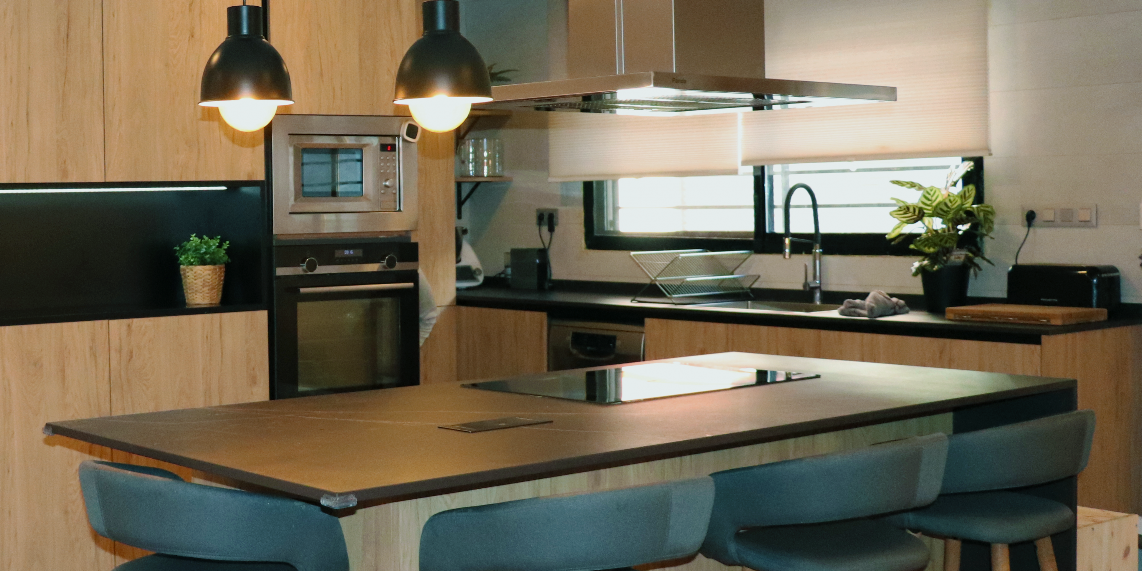 Pero esta cocina está llena de detalles, como la luz del hueco abierto, que se enciendo con sensor táctil. O el enchufe push que encontramos en la isla y que permite ganar espacio de trabajo. Siguiendo con los detalles que la hacen única, podemos remarcar el espacio de almacenamiento. Y es que no solo debe ser una cocina bonita, también es muy importante que sea práctica y eficiente. Para conseguirlo hemos creado una despensa donde todo es muy fácil de extraer, además de la zona con estantes que, no refuerza la continuidad, también añade espacio de almacenamiento.