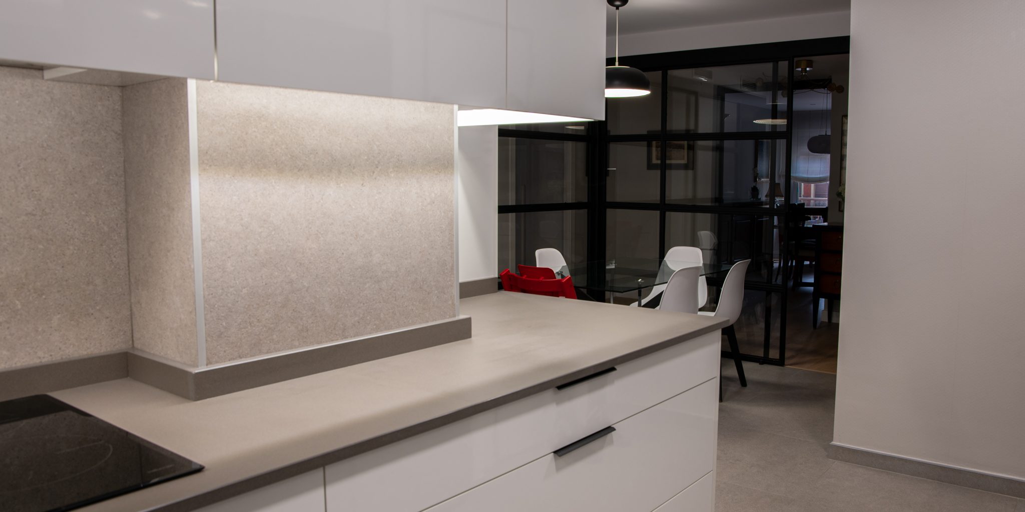 En este #ProyectoCSG hicimos diferentes cosas. Por una parte, la reforma integral de la cocina. Tiramos los tabiques y los sustituimos por fijos de cristal con perfilería negra, así conseguimos delimitar el espacio, pero con más luz y amplitud.
