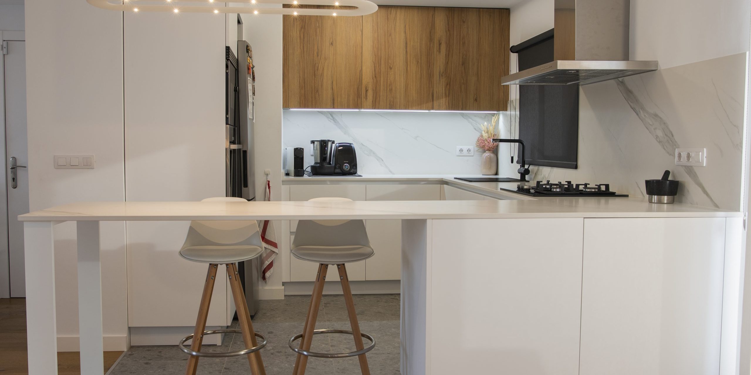 Para conseguirlo tiramos la cocina abajo, abrimos el concepto y empezamos desde cero. Combinamos el blanco y la madera de roble de la siguiente manera: los muebles altos en madera y el resto en blanco mate. La encimera también era en blanco, pero con el detalle de las vetas en un tono gris.