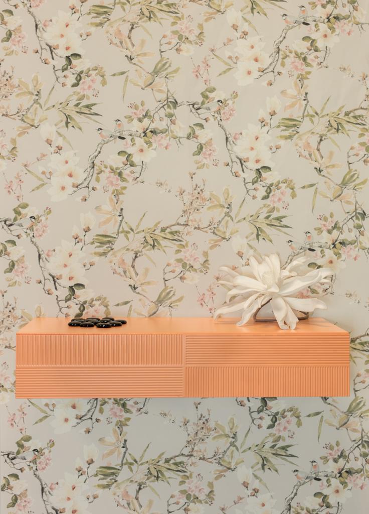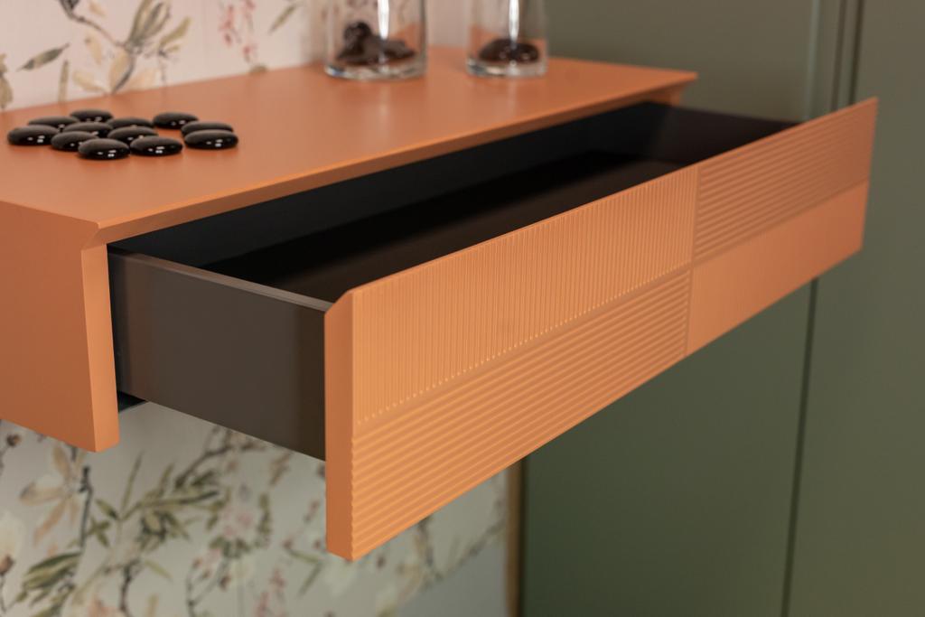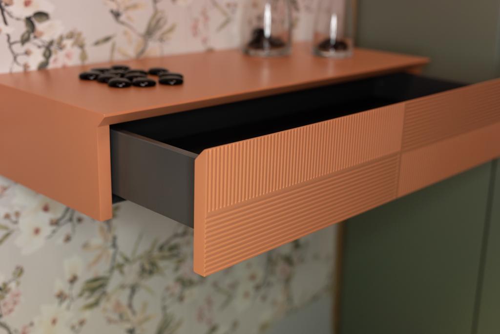 Disponemos de 4 diseños en el frontal realizado con rebajes dándole formas asimétricas. El mueble es sin tirador y apertura gola con el canto del cajón a 45 °